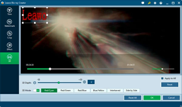 Open the "3D" tab, by moving "3D Effect" option to green, you could burn 2D videos to 3D Blu-ray/DVD movies with 6 different 3D effects available: Red/Cyan, Red/Green, Red/Blue, Blue/Yellow, Interleaved. The 3D Depth could also be adjusted. You could get instant preview of selected 3D effect.
