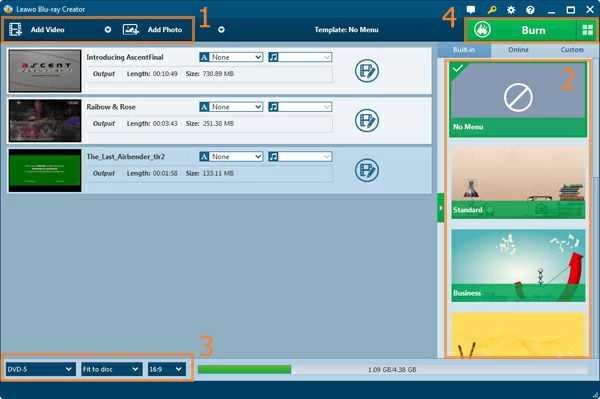 Click on the "Add Video" or "Add Photo" icon to browse videos or images on your computer and then load those you want to burn to Blu-ray or DVD disc into the software. Or you only import files via direct drag-and-drop. This Blu-ray burner allows you to add external subtitles to video and you can also make a selection on audio channel. The loaded files could be displayed in thumbnails or details. After loading, you could select display method; play back loaded files, select subtitles and audio tracks, etc.