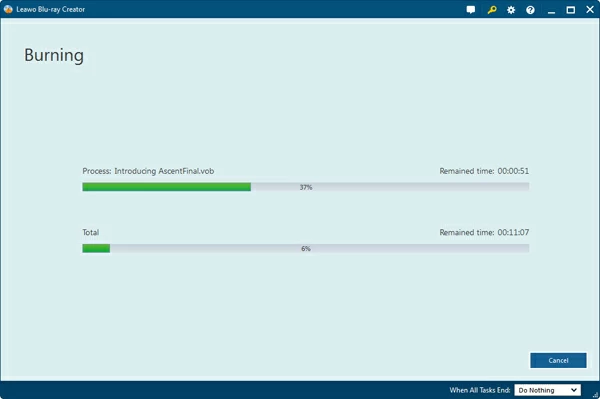 Click the "Burn" button at the bottom of the burning settings panel to start video to Blu-ray/DVD burning. This Blu-ray Creator would then carry out the burning processes one by one. On the Burning interface, you could view the burning progress and do after-done settings.