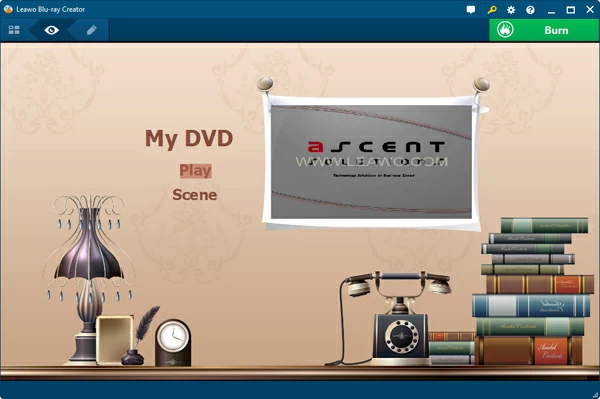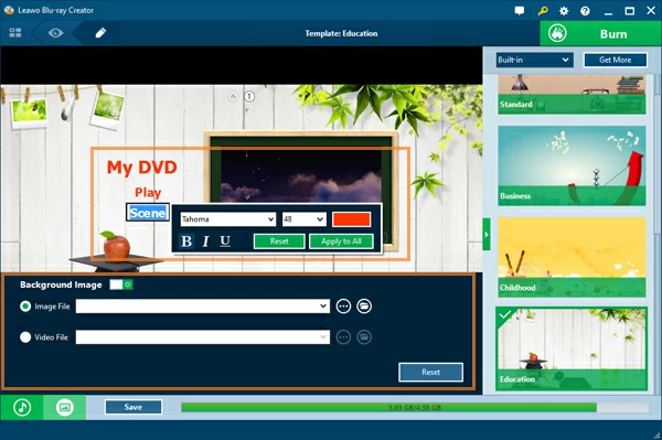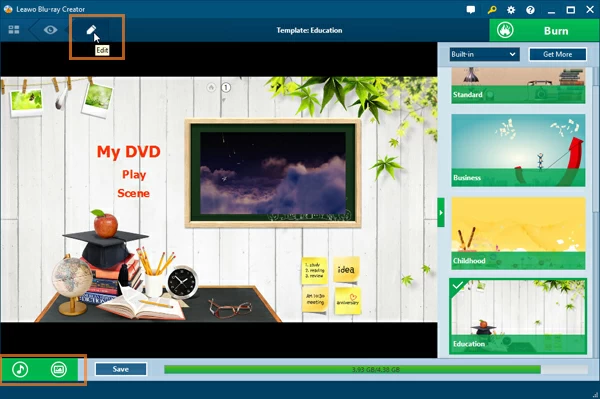 After editing, you could click the blue "Save Template" button to save edited disc menu template into Custom group. Then, move mouse to the big green "Burn" button to continue the video to Blu-ray/DVD burning progress.