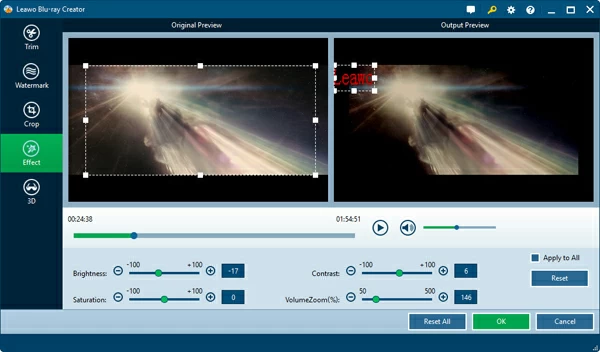 Effect: Under "Effect" tab, you can adjust video effect. Move the sliders to adjust video brightness, contrast, saturation and Volume Zoom.