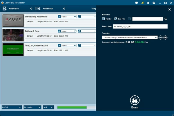 Choose to burn to DVD-5/DVD-9/BD-25/BD-50, and set aspect ratio as 4:3 or 16:9 (when burning to Blu-ray, only 16:9 is available), and select quality in "Fit to disc" at the bottom of the main program interface. Space needed for Blu-ray or DVD burning can be accessed. Click the big green "Burn" button on the top right corner to invoke more burning settings, including Burn to, Disc Label, Save to, etc.