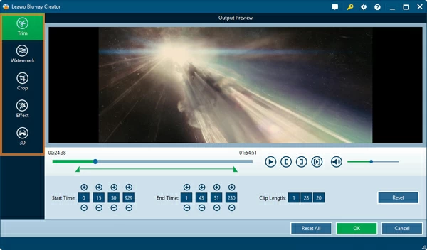 Trim: Under the "Trim" tab, you can trim video to milliseconds. Drag the slider to cut video length or set values in Start Time and End Time boxes. You will see the total Clip Length.