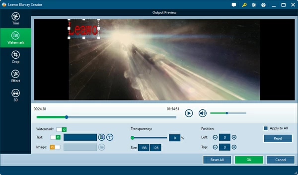 Watermark: Under the "Watermark" tab, you could add logo or banner to your video. Switch "Watermark" option to green and then you could add either image or text watermark. Video transparency, left margin, top margin and image size can be set.