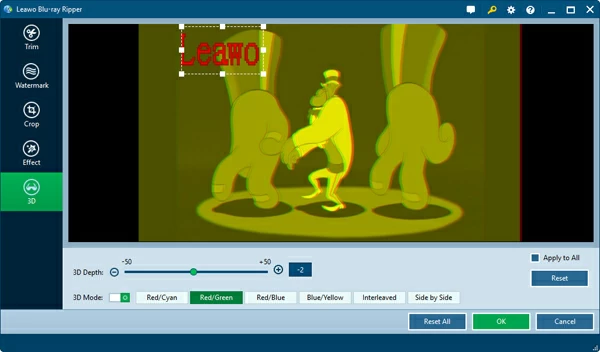 Open 3D tab, and slide 3D Mode to green. Then you could select 3D effect, adjust 3D Depth and get instant preview of 3D effect. 3D effects available include: Red/Cyan, Red/Green, Red/Blue, Blue/Yellow, Interleaved, Side by Side.
