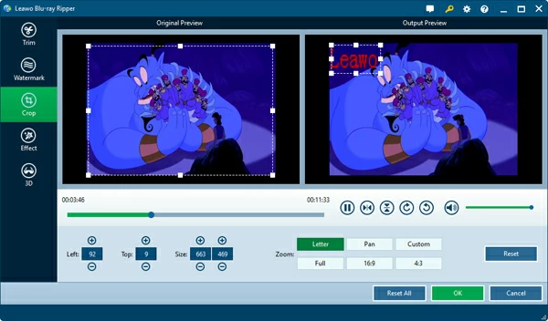 In Crop tab, set the "Left" and "Top" parameters, select a Zoom type, or adjust the dot frame on the left Original Preview window to remove the back margins and unwanted parts on the video frame.