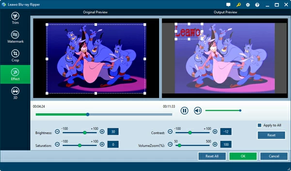 In Effect tab, change video Brightness, Contrast, Saturation and Volume Zoom, and get instant preview.