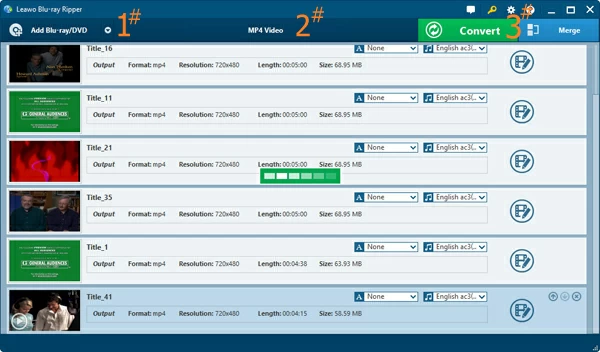 Click "Add Blu-ray/DVD" (1) button on the sub-menu bar to load source Blu-ray disc or folders. You could directly load Blu-ray disc from disc drive by clicking the invert triangle button. Also, you could drag and drop source Blu-ray movies to the program. While loading, 3 loading ways are selectable: Full Movie, Main Movie and Custom Mode. Select desired one to load source Blu-ray movies.
