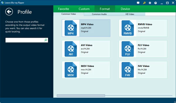 Select one file on the processing list panel, then click the "MP4 Video" (2) button (the button next to Add Blu-ray/DVD button) to set output profile. Click "Change" button to select a profile as output format, click "Edit" button to adjust the parameters of selected profile, and if you need, click "Apply to all" button to set select profile as output profile for all loaded files. On Profile panel, you could add formats to Favorite, Custom profile, select profile from Format or Device groups.
