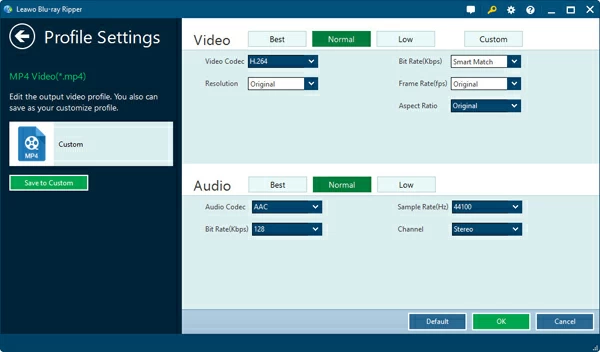 Tip: Output file parameters could be reset to meet your devices or players more. On the sub-menu bar, after setting output profile, click the drop-down button next to "Add Blu-ray/DVD" button and then select "Edit" option to enter the Profile Settings panel. On the Profile Settings panel you can reset parameters including: Video Codec, Quality, Resolution (choose from provided options or input desired video size according to your devices or players manually), Bit Rate, Frame Rate, Aspect Ratio, Audio Codec, Audio Quality, Bit Rate, Sample Rate, Channels, etc. After adjusting, click "OK" to quit the Profile Settings panel. You could also name it and then click the "Save to Custom" option on the left side to save adjustments.