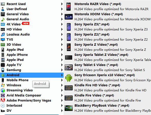Fortunately, the Kindle Fire presets are ready in "Android" category. All you have to do is head to the category, and select "Kindle Fire HD Video (*.mp4)", or "Kindle Fire Video (*.mp4)".