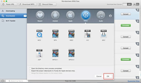 Then, choose an output format and the preferred options on the bottom, then click "OK". The application will now proceed to convert your YouTube videos to format (WMV, MOV, MP4, MKV, AVI...) you choose on Mac.